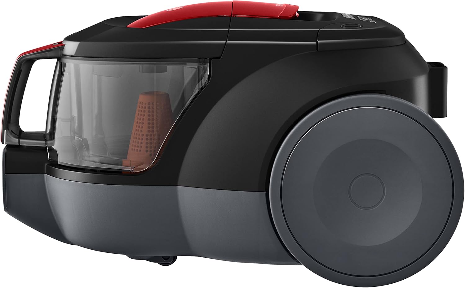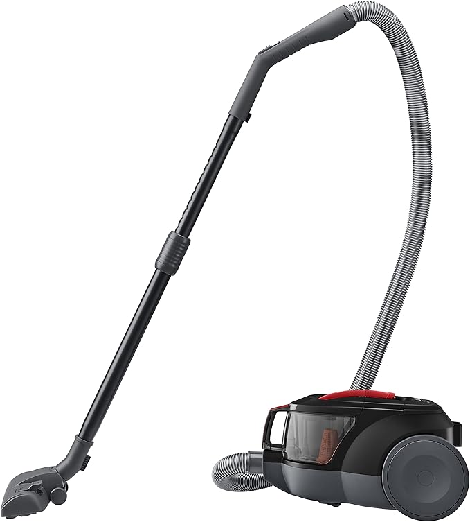 فهي مكنسة كهربائية من نوع بدون كيس (Bagless)، كما تتميز بتصميم مدمج وخفيف الوزن بلون أحمر لامع.